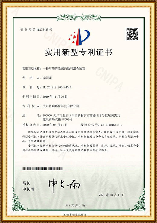 • 實用新型專利證書(一種甲醛清除劑的原料混合